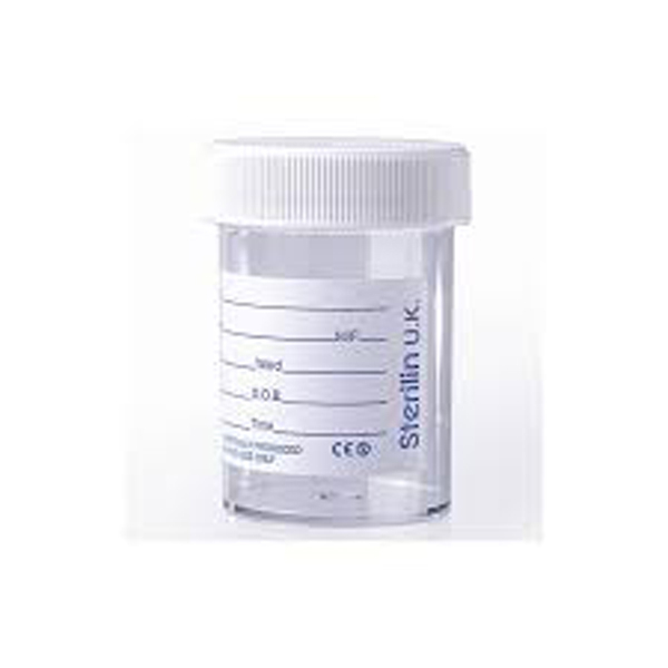 The urine bottle has a 60ml capacity and comes with a printed label for identification and a plastic cap to seal the sample.